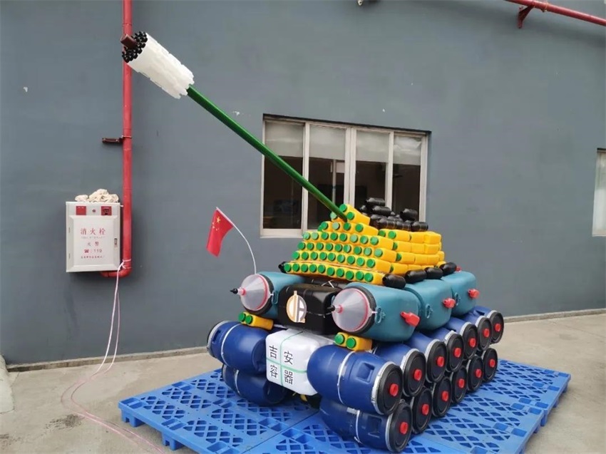 用鐵箍桶組成的坦克,搭配方瓶蓋作為點綴,1L方瓶作為主體,大炮用指甲油瓶拼接而成,方罐、漏斗、圓瓶等采用多系列產品進行混搭,居然視覺上毫無違和感,整體效果棒棒噠!