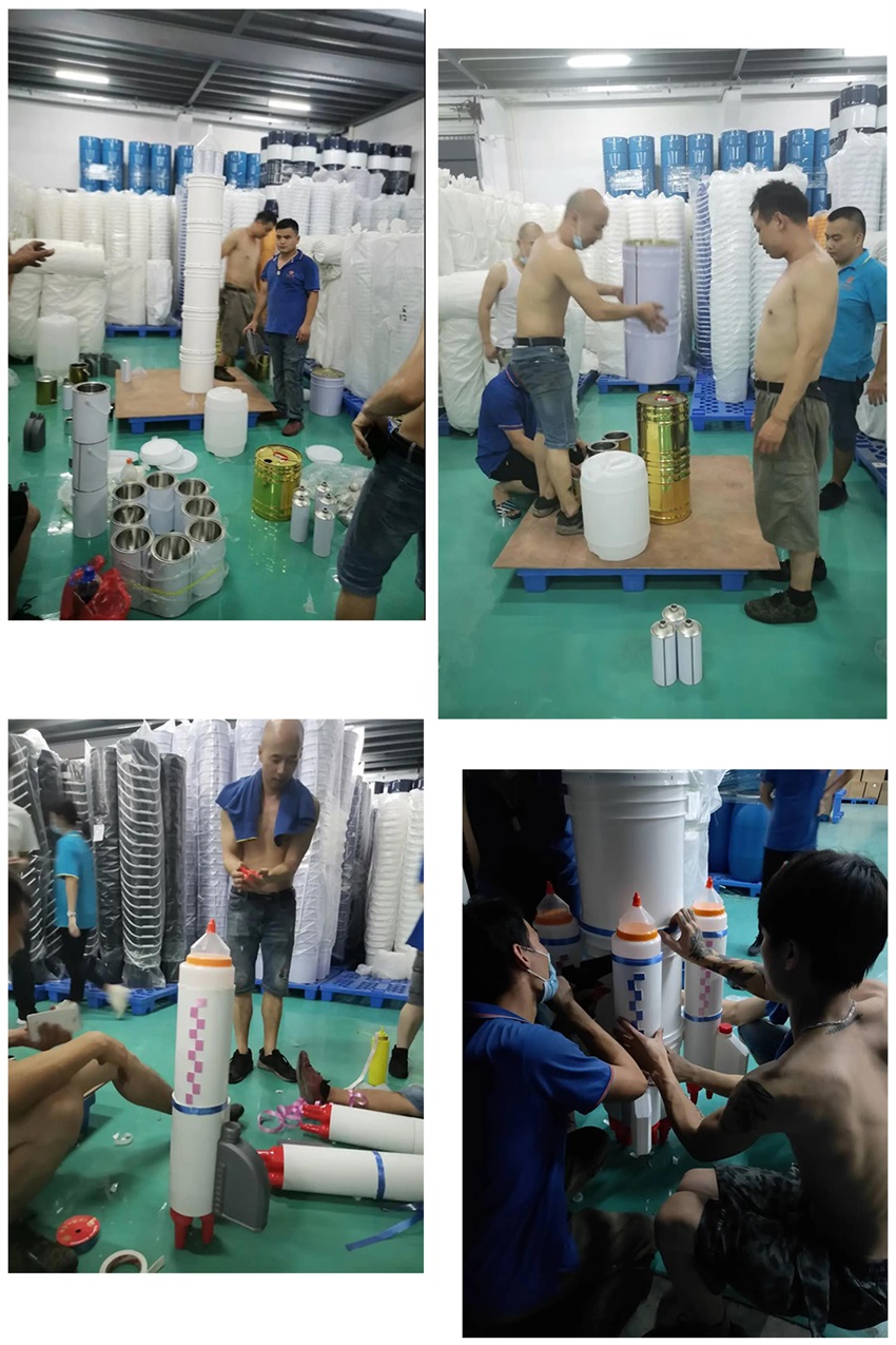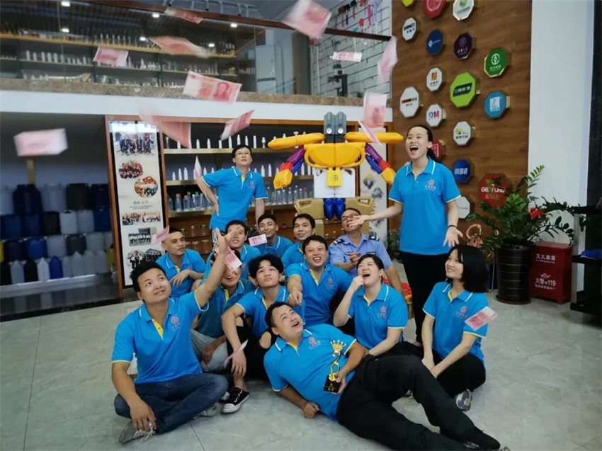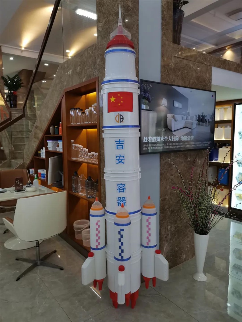在試用了鐵罐、灰色機油瓶、膠水瓶等產品均不理想之后,最終敲定采用純色風格產品元素搭配藍色邊框設計,發(fā)射中的火箭寓意我們團隊業(yè)績一飛沖天,直沖云霄!