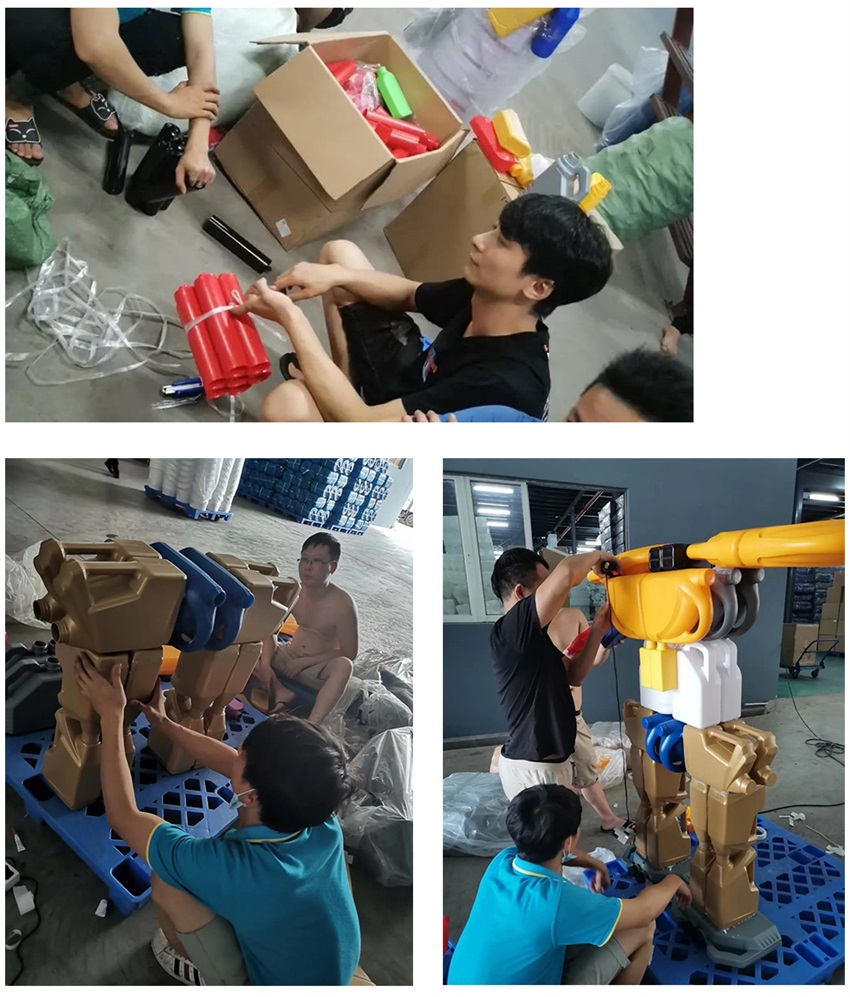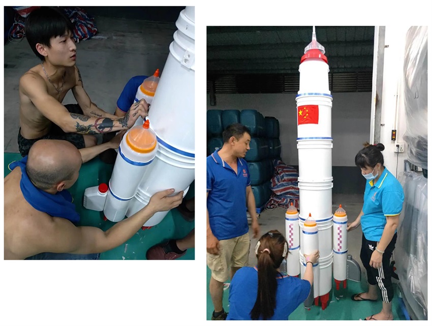 該隊模型作品”一波三折”,前期討論了多種方案,最終借鑒超市堆碼花式陳列的方式,確定做輪船,用方瓶,圓瓶、機油瓶系列進行輪船的設計,該作品象征吉安容器未來將繼續(xù)乘風破浪,披荊斬棘,勇往直前,揚帆遠航。