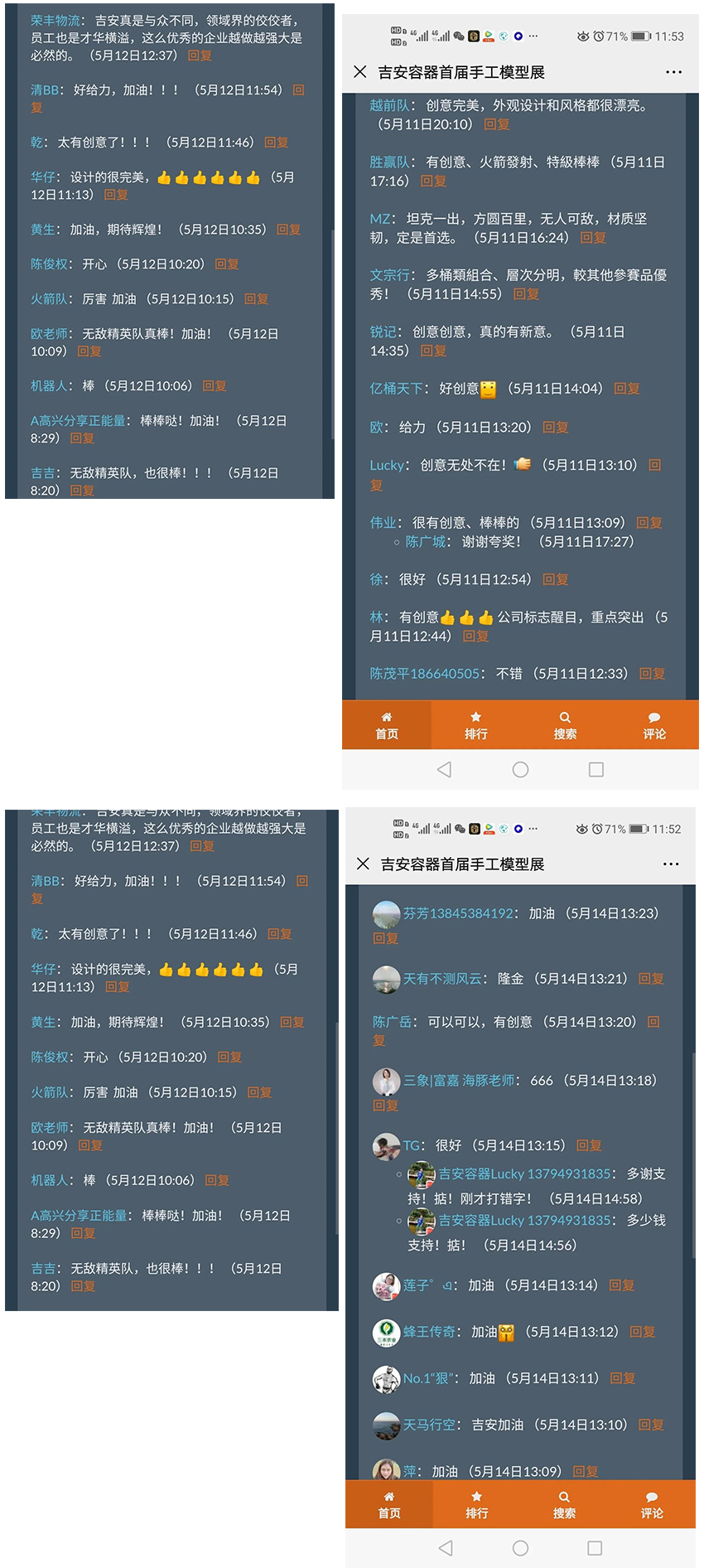 票數(shù)你追我趕,排行榜第一位輪流做,這時候是提現(xiàn)人脈和拉票技巧的時候啦!朋友圈也給“吉安大軍”包圍,很快我們也包圍了各自的微信群,各隊差距變得越來越不明顯,在雙方展開激烈的線上廝殺之時,越前隊率先出大招,夜市拉票!他們決定把他們的作品機器人搬出夜市,勇敢的向別人展示他們的作品,進行線下拉票。