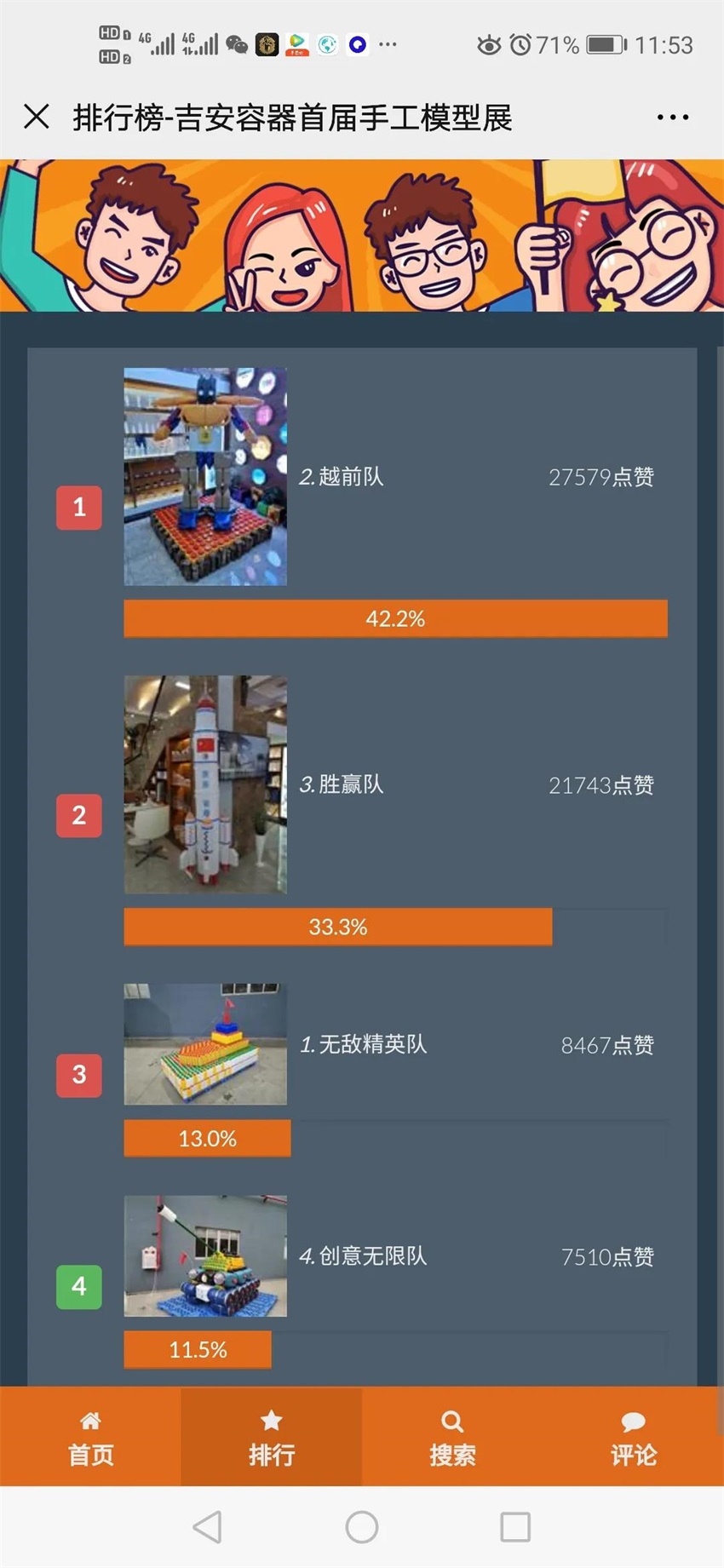 首屆創(chuàng)意手工模型大賽圓滿落下帷幕,感謝每一位支持我們的朋友們,正是因為有了您們的支持和鼓勵,使得我們整個團隊更加充滿信心,我們將繼續(xù)發(fā)揮創(chuàng)新、專研、拼搏的精神,本次活動帶給我們的刺激、興奮、驚險、也更深刻的體會到擔當、分工、合作、協(xié)助、理解的重要性。我們的拉票行為可能會給大家?guī)砝_,給您們添麻煩了!活動的成功離不開每一位客戶朋友們對本次活動的包容及大力支持!再次感謝!我們將繼續(xù)發(fā)揚“吉安精神”,為客戶提供更高價值,為團隊奉獻更大力量!