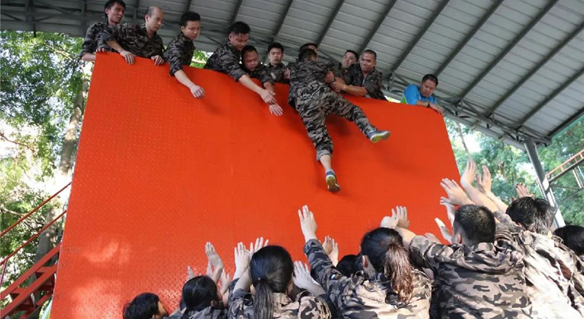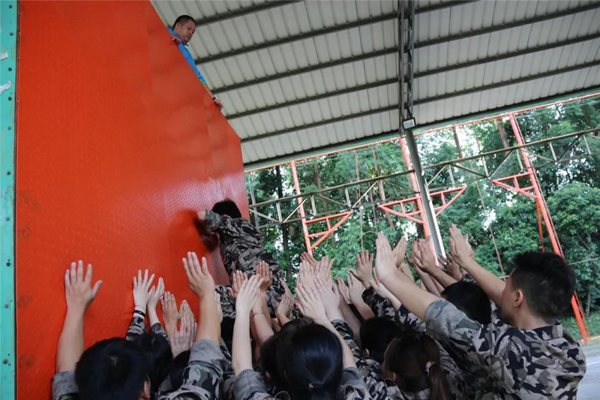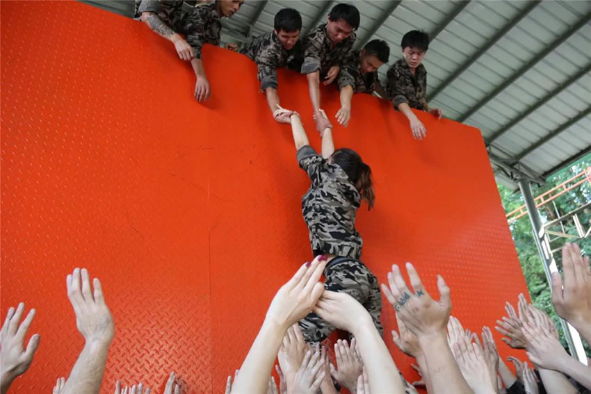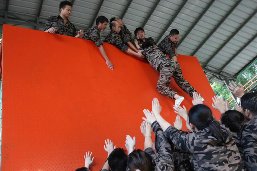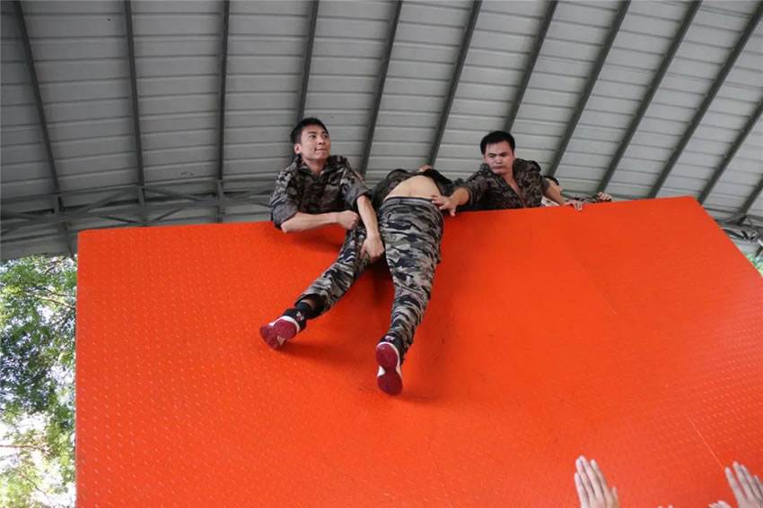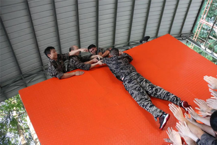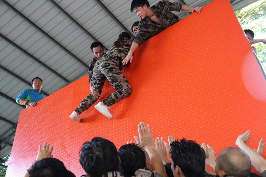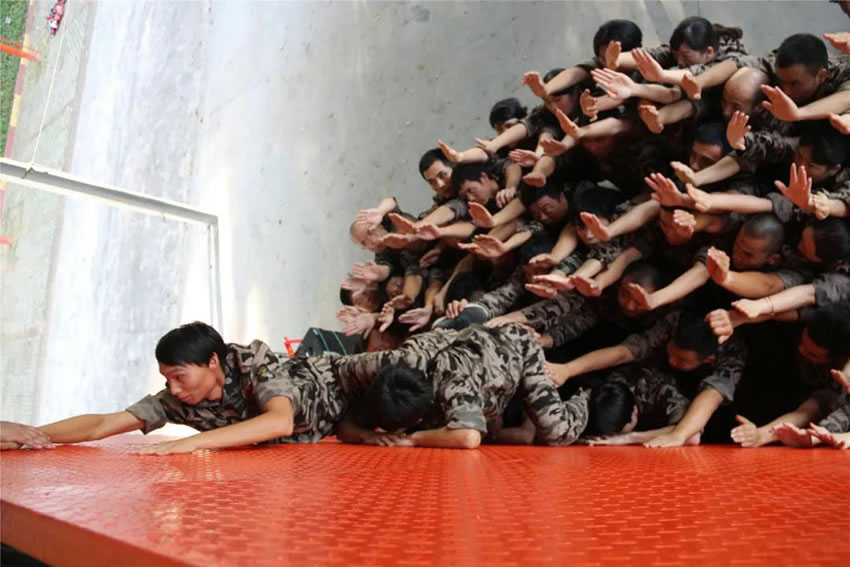 所有參與者在不借助任何工具和外力的情況下,相互協(xié)作,堆成人墻,每人徒手翻越過(guò)一堵 4.2 米高的墻。所有過(guò)程都只需要通過(guò)人力,不能自主蹬墻爬墻,不管環(huán)節(jié)中哪一個(gè)人犯規(guī)哪怕是最后一位,也需要整個(gè)團(tuán)隊(duì)重新再來(lái)。
