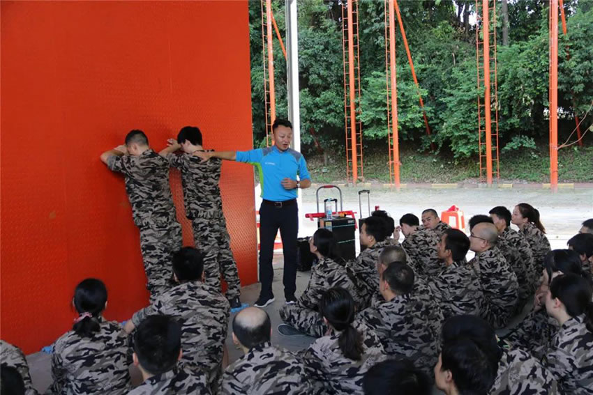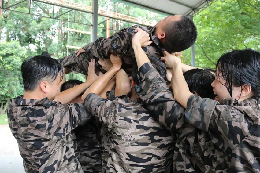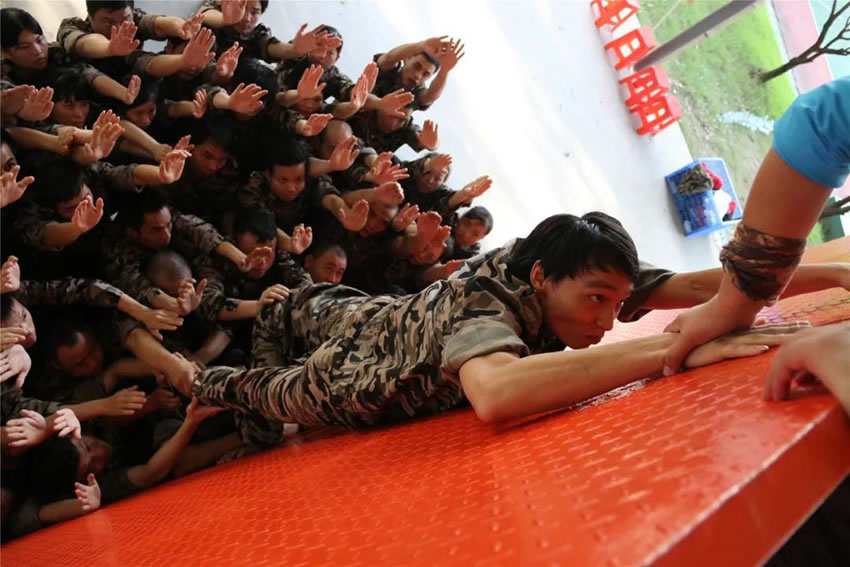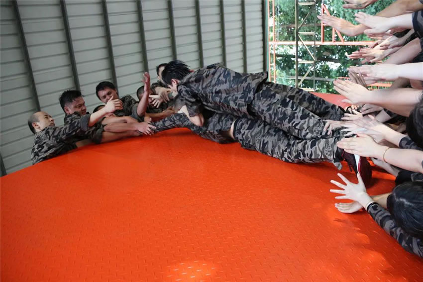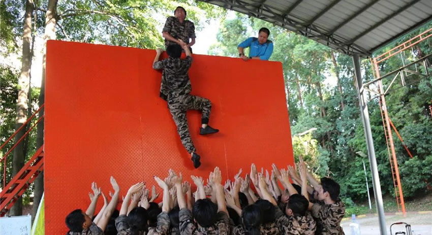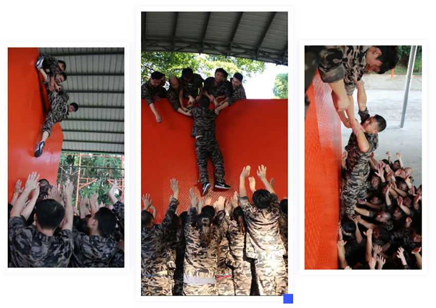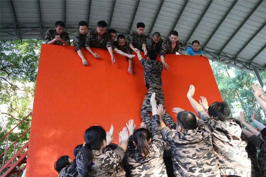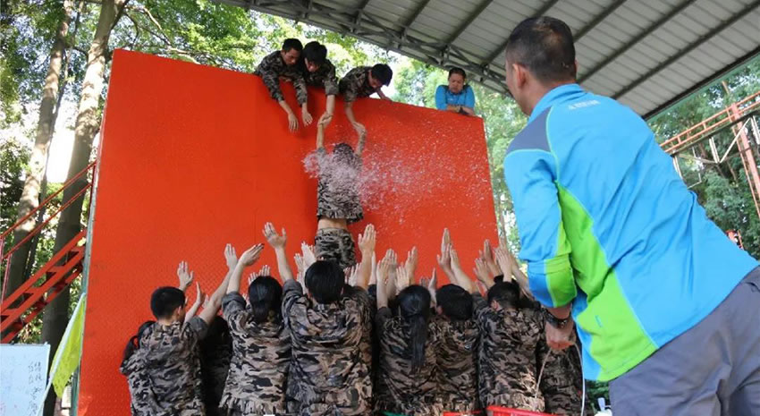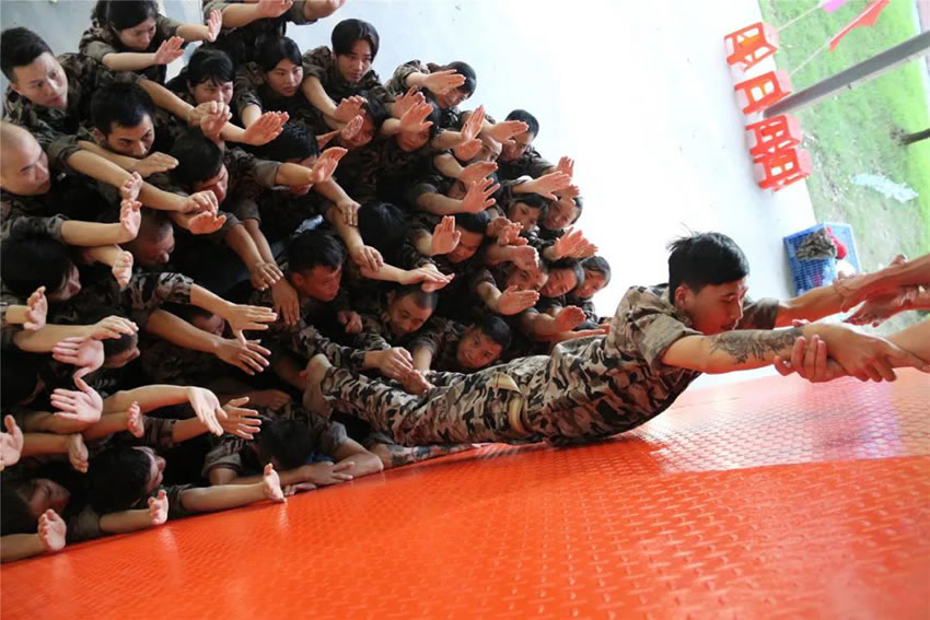 所有參與者在不借助任何工具和外力的情況下,相互協(xié)作,堆成人墻,每人徒手翻越過(guò)一堵 4.2 米高的墻。所有過(guò)程都只需要通過(guò)人力,不能自主蹬墻爬墻,不管環(huán)節(jié)中哪一個(gè)人犯規(guī)哪怕是最后一位,也需要整個(gè)團(tuán)隊(duì)重新再來(lái)。