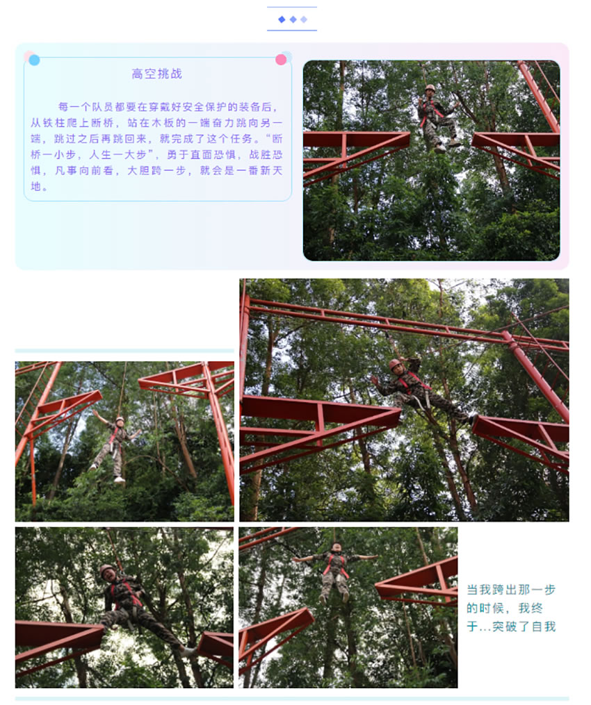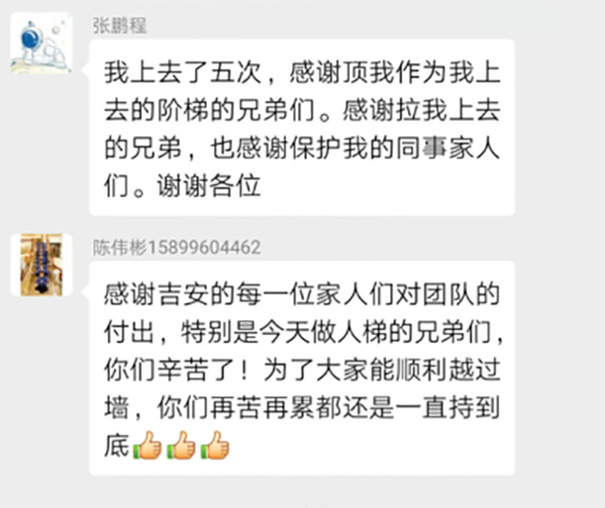 大家用肩膀、大腿、手臂,血肉之軀,組成了一面梯子,一個(gè)個(gè)踩著他們,翻過(guò)那面墻, 我們用無(wú)聲的語(yǔ)言,一個(gè)個(gè)把同事送上墻的另一面,當(dāng)?shù)谝淮文_踩在人身上的時(shí)候,原來(lái),痛的不僅僅是被踩的那個(gè)人,當(dāng)腳踩在別人身上不敢用力,而不用力根本上不去的時(shí)候,心中有一塊地方,隱隱作痛,當(dāng)上面的人用堅(jiān)定的眼神向你伸出了雙手,用他最大的力量把你拉上來(lái)時(shí),在沒(méi)有任何保護(hù)只有人墻的情況下,內(nèi)心想的不是恐懼,而是放心,我放心我的伙伴不會(huì) 讓我掉下來(lái),我放心我上面的伙伴會(huì)把我拉上來(lái),我感謝那些拉我、推我、扶我鼓勵(lì)我的每個(gè)人。我看到了那個(gè)從頭到尾踩了不下上百次的人墻,他從頭到尾沒(méi)有叫過(guò)一聲的累,哪怕是教練說(shuō),累了,可以換人,可是,他們,從開(kāi)始到結(jié)束,默默的承受這一切,你退下了,總有人要頂上,痛苦不會(huì)因?yàn)榉艞壎Y(jié)束,而總會(huì)有人,負(fù)重前行。