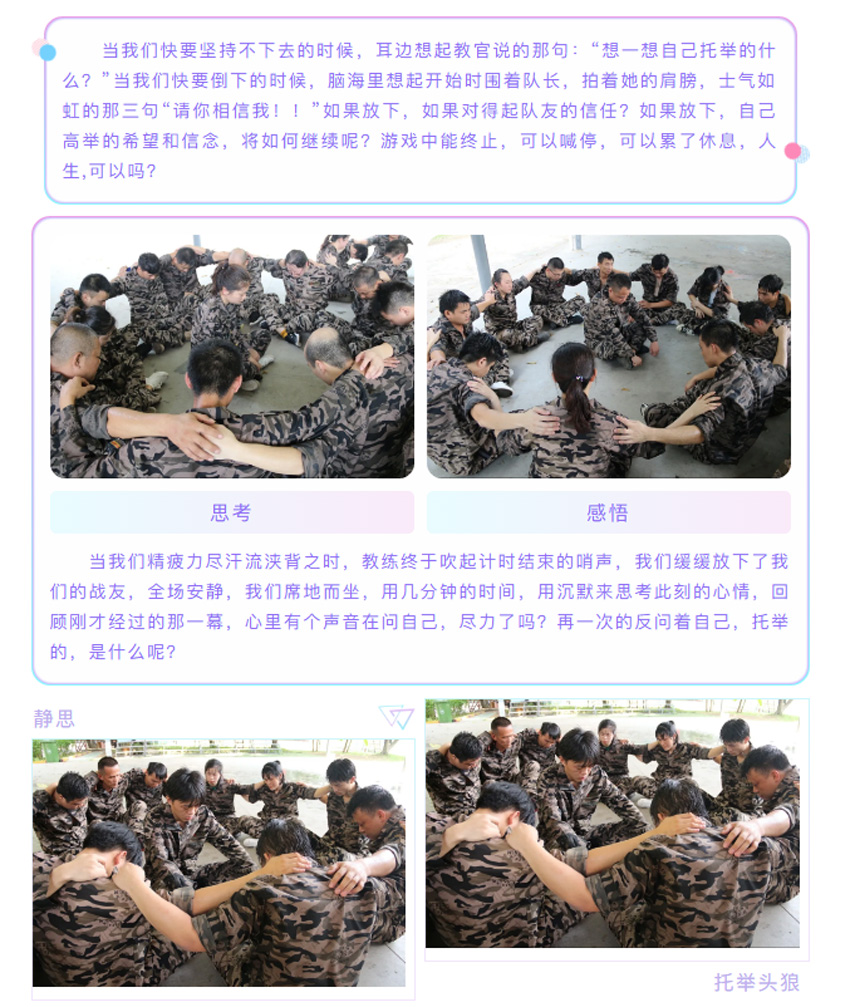 2 、被托舉的學(xué)員必須全身放松,整個(gè)過(guò)程中堅(jiān)持托舉30分鐘;在這期間組員不能松懈,手臂必須保持伸直的狀態(tài),過(guò)程中如有學(xué)員違反任何規(guī)則,將增加全體托舉時(shí)間或者減少托舉人數(shù)。