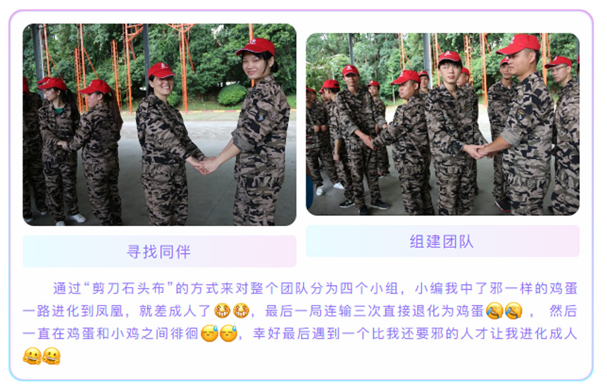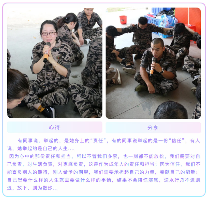 通過(guò)重復(fù)站軍姿、喊口令的方式,訓(xùn)練我們的自律能力,在教官嚴(yán)格的命令下,我們必須像軍人一樣的站直,紋絲不動(dòng),我們要根據(jù)教官的要求完成任務(wù),并不是要求我們的動(dòng)作要和軍人一樣標(biāo)準(zhǔn),最重要的一點(diǎn)是要學(xué)會(huì)軍人的態(tài)度,態(tài)度及心態(tài)決定一切,你是以什么樣的心態(tài)來(lái)對(duì)待一件事情,就會(huì)帶來(lái)什么樣的結(jié)果。在最后的執(zhí)行教官在30秒鐘之內(nèi)找到6個(gè)人擁抱大聲說(shuō)出“你是我最棒的朋友”這一環(huán)節(jié)中,對(duì)我觸動(dòng)頗深,當(dāng)我聽(tīng)到命令后馬上展開(kāi)了行動(dòng)并且迅速提前完成了任務(wù),感到沾沾自喜??森h(huán)節(jié)結(jié)束后教官問(wèn)我們,你能做得更好嗎?你的時(shí)間和能力就只能完成6個(gè)了嗎?我想,是啊,我明明可以做得更好,我還有時(shí)間,為什么我會(huì)在完成指標(biāo)后停???是自己理解錯(cuò)了教官的意思還是我只想完成相對(duì)應(yīng)的任務(wù),僅此而已呢?我想,兩者都有,我在工作中是否能夠“創(chuàng)造更高價(jià)值?奉獻(xiàn)更大力量?”我是否可以發(fā)揮更大空間?我是否做到公司文化中的其中多一點(diǎn):做任何工作,盡可能比公司和上司要求的多一些,超越他們的期望。。。在這個(gè)環(huán)節(jié),我們首先學(xué)會(huì)的是,做人的心態(tài);對(duì)待工作的態(tài)度。