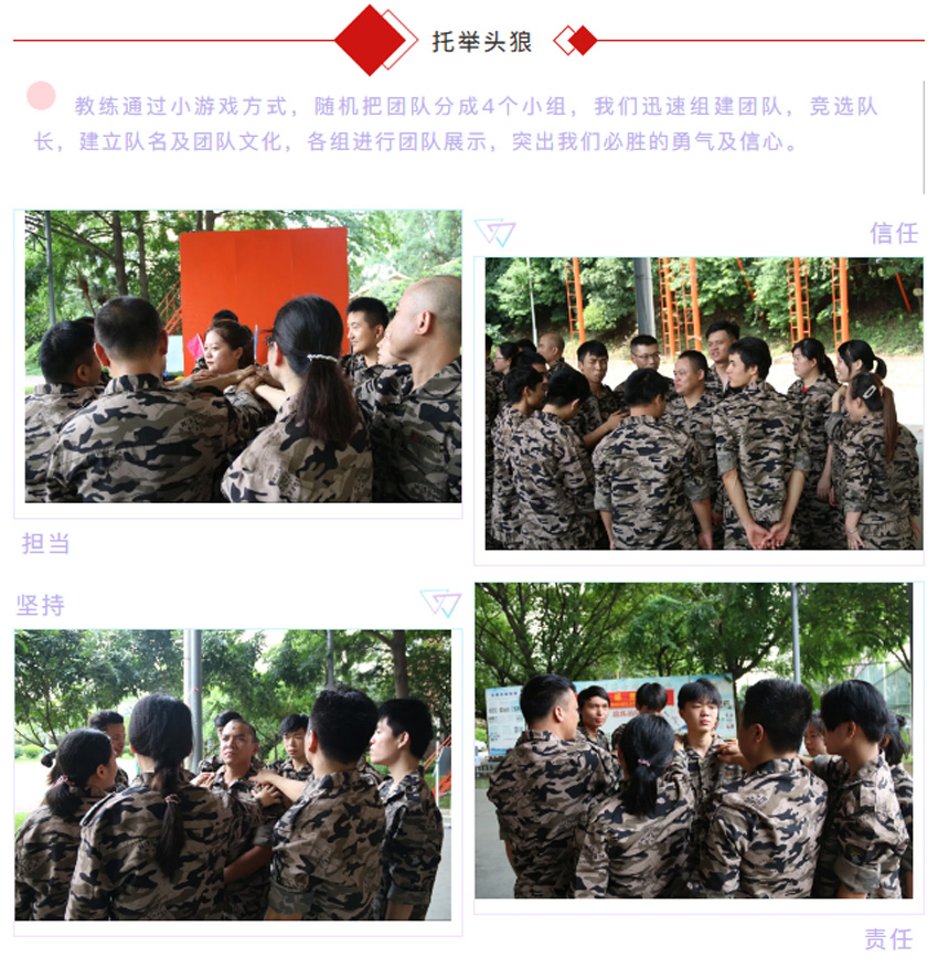 1 、“托舉頭狼”即全體組員把隊(duì)長(zhǎng)托舉起來(lái),手臂需要全程伸直,只用手臂的力量撐起整個(gè)人。