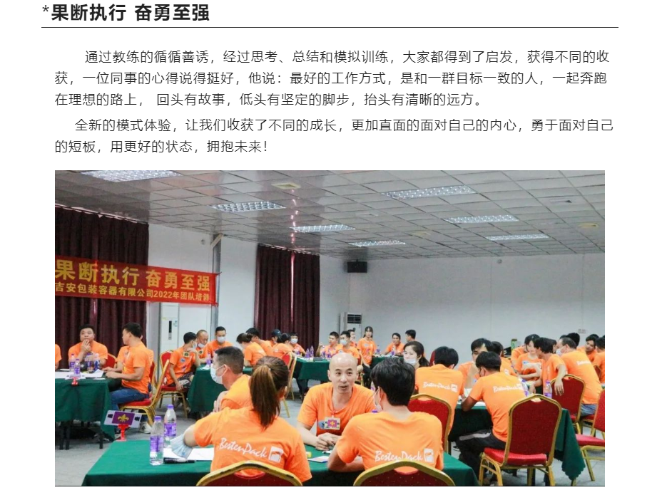 吉安容器2022年度團隊培訓如期舉行,前幾次的培訓重點是在“拓展”項目中通過挑戰(zhàn)和趣味性游戲的方式,讓團隊更加直觀的面對問題,三和團建根據(jù)每一次的培訓情況,制定科學方案,拓展項目更多的重點在于如何提高團隊的凝聚力,而今年我們開啟了全新的模式,通過《沙盤模擬課程》,啟發(fā)大家的全新思維模式,實現(xiàn)如何有效溝通,如果實現(xiàn)跨橋梁對接。