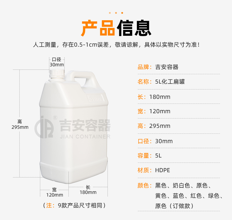塑料扁罐采用HDPE原材料吹塑而成,具有良好的耐酸堿性及密封性,方形設(shè)計方便堆放,不占用空間,美觀實用。具備不變形,使用方便等特征,可根據(jù)客戶需求做印刷及貼膜,產(chǎn)品適用于尿素、機(jī)油、汽油、清洗劑、化工助劑、食品添加劑等液體包裝。