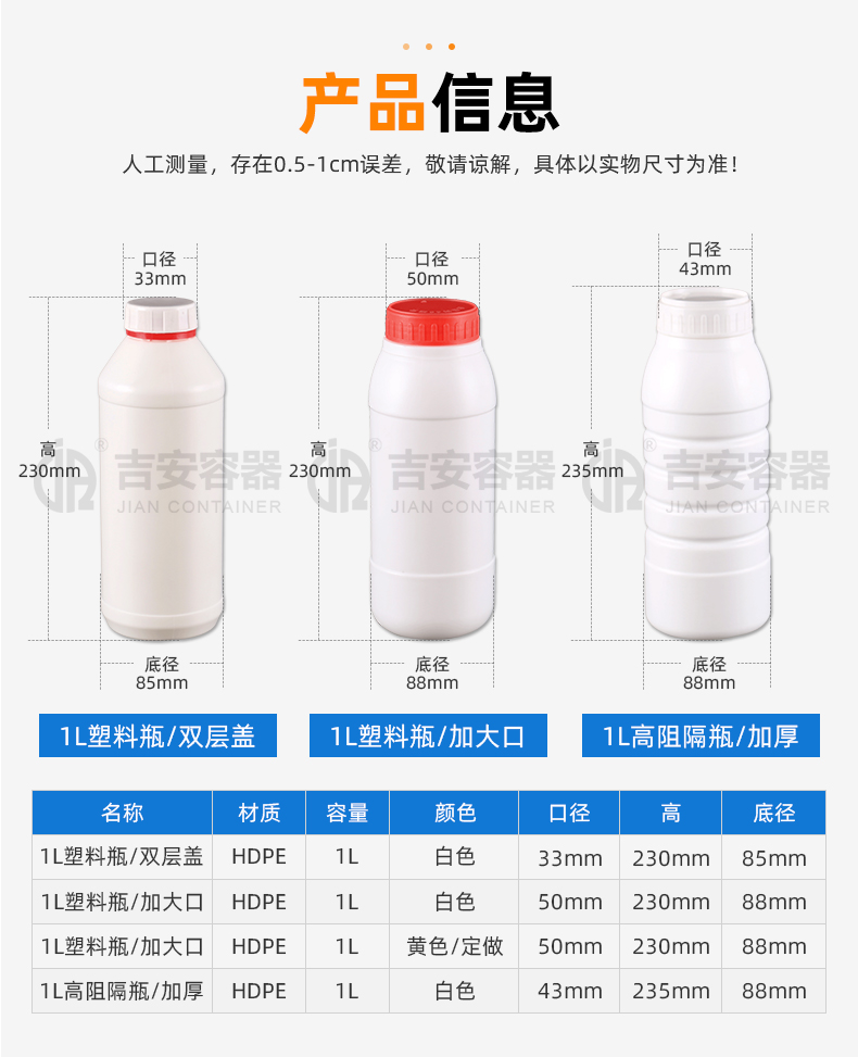 東莞市吉安包裝容器有限公司創(chuàng)立于2000年8月1日,是中國知名品牌企業(yè)。已通過ISO 9001質(zhì)量管理體系資質(zhì)認(rèn)證,加入了中國中空協(xié)會,并獲得《中國知名品牌》,《國家標(biāo)準(zhǔn)合格產(chǎn)品》,《全國重合同守信用AAA級企業(yè)》,《質(zhì)量.服務(wù).誠信AAA企業(yè)》等榮譽稱號。根據(jù)材質(zhì)的不同,我們的產(chǎn)品分為塑料容器、鐵質(zhì)容器、鋁材容器、玻璃容器、紙質(zhì)容器等五大類。按產(chǎn)品的名稱分為塑料桶、塑料瓶、包裝桶、涂料桶、機油桶、油脂桶、化工罐、膠水瓶、鐵桶、鐵罐、鋁瓶、鋁罐、阻隔瓶、高阻隔瓶等,容量從3ML至1000L多種規(guī)格,多種款式。適合包裝的產(chǎn)品包括:化學(xué)試劑、化工原料、化工助劑、飼料添加劑、油墨、油漆、樹脂農(nóng)藥、日用化學(xué)品、聚氨脂、膠粘劑,廣泛應(yīng)用于化工、建筑、食品、醫(yī)療、生物等各領(lǐng)域。