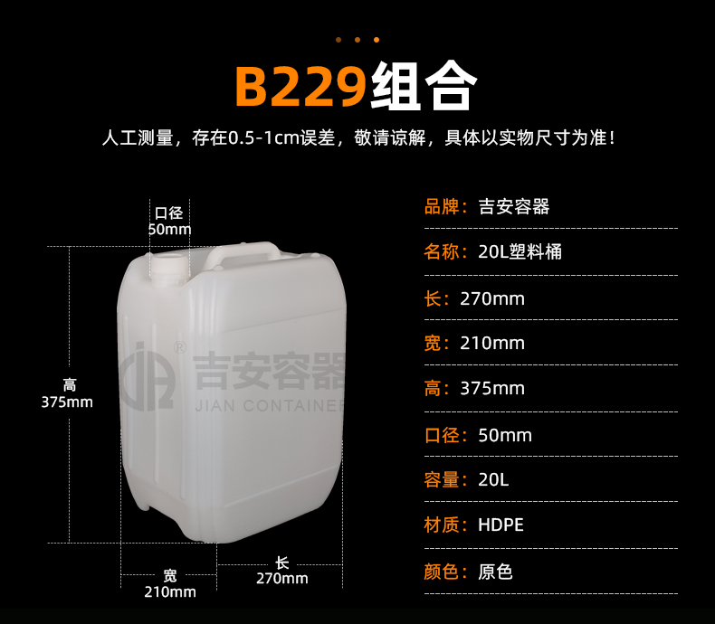 東莞市吉安包裝容器有限公司創(chuàng)立于2000年8月1日,是中國知名品牌企業(yè)。已通過ISO 9001質量管理體系資質認證,加入了中國中空協會,并獲得《中國知名品牌》,《國家標準合格產品》,《全國重合同守信用AAA級企業(yè)》,《質量.服務.誠信AAA企業(yè)》等榮譽稱號。根據材質的不同,我們的產品分為塑料容器、鐵質容器、鋁材容器、玻璃容器、紙質容器等五大類。按產品的名稱分為塑料桶、塑料瓶、包裝桶、涂料桶、機油桶、油脂桶、化工罐、膠水瓶、鐵桶、鐵罐、鋁瓶、鋁罐、阻隔瓶、高阻隔瓶等,容量從3ML至1000L多種規(guī)格,多種款式。適合包裝的產品包括:化學試劑、化工原料、化工助劑、飼料添加劑、油墨、油漆、樹脂農藥、日用化學品、聚氨脂、膠粘劑,廣泛應用于化工、建筑、食品、醫(yī)療、生物等各領域。