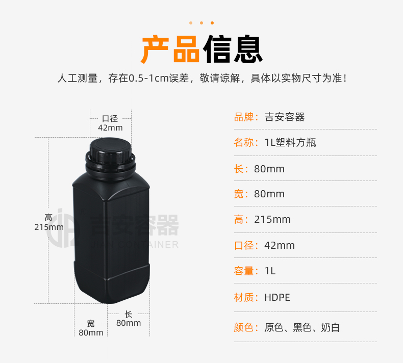 小口塑料瓶采用全新HDPE塑膠原料吹塑而成,具備韌性好、耐酸堿、耐腐蝕、不變形,密封性能佳等特點(diǎn),可根據(jù)客戶需求定制、改色、產(chǎn)品適用于化工、清洗劑、醫(yī)藥、液體、食品、農(nóng)業(yè)等各行業(yè)包裝。
