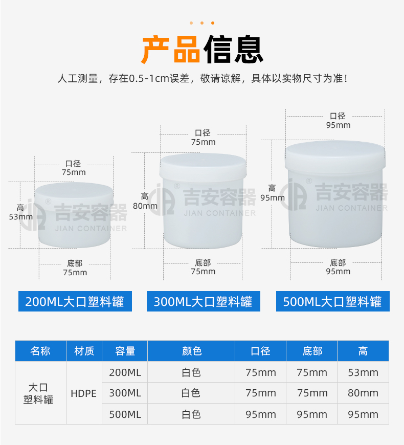 大口塑料瓶可分為螺旋式外蓋,按壓蓋外蓋、螺旋帶防盜等多種密封方式,內(nèi)外壁光滑,敞口盛裝、倒放物品方便,耐酸堿、耐腐蝕,無味,防漏性強(qiáng)。