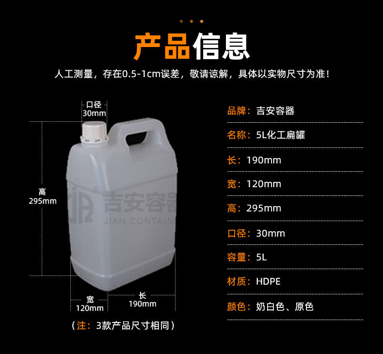 塑料扁罐采用HDPE原材料吹塑而成,具有良好的耐酸堿性及密封性,方形設(shè)計方便堆放,不占用空間,美觀實用。具備不變形,使用方便等特征,可根據(jù)客戶需求做印刷及貼膜,產(chǎn)品適用于尿素、機油、汽油、清洗劑、化工助劑、食品添加劑等液體包裝。